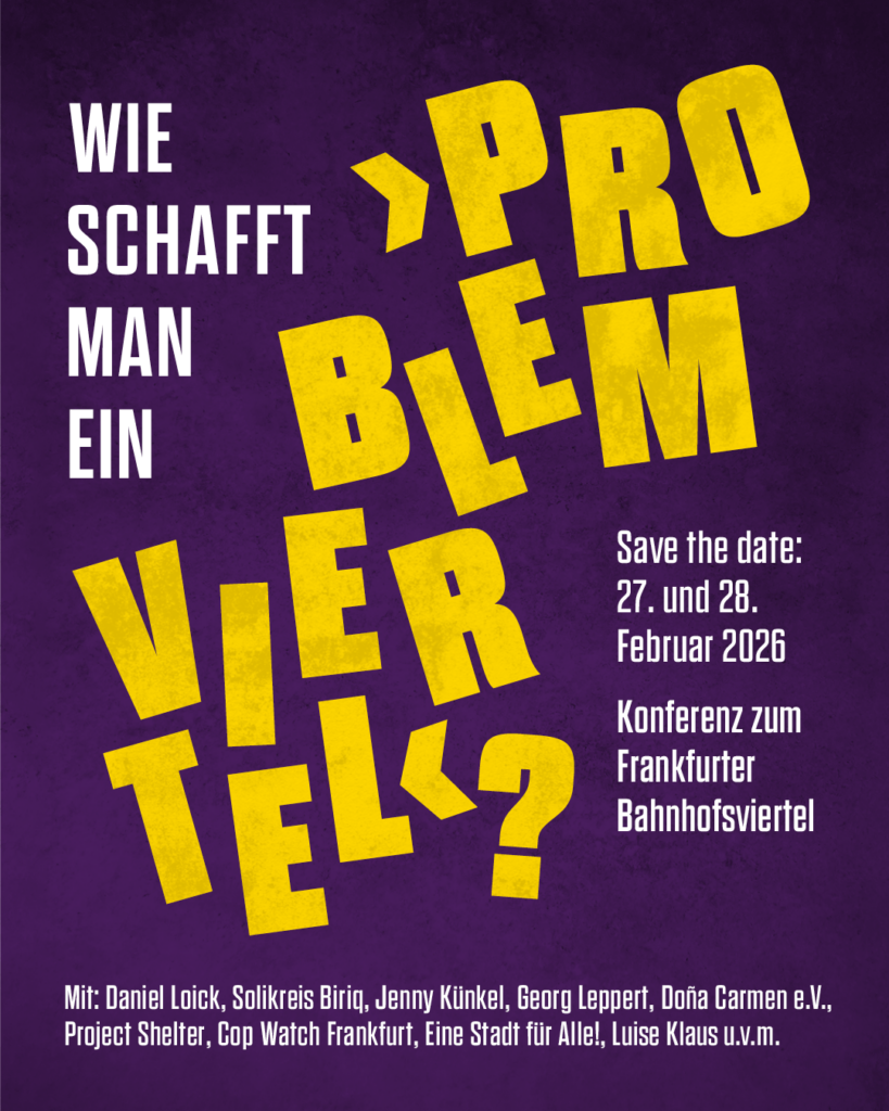 Im Zentrum steht die Frage, wie das Bahnhofsviertel als „Problemviertel“ beständig (re-)produziert wird und welche Interessen, Machtverhältnisse und Regierungsweisen sich darin widerspiegeln. Gleichzeitig richtet die Konferenz den Blick auf alltägliche Akte des Widerstands, der Solidarität und der Möglichkeit, urbane Räume anders zu denken und zu gestalten.